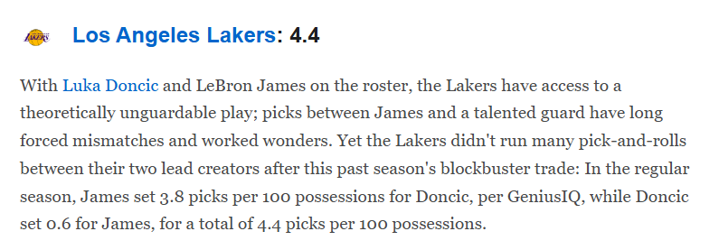 由于阵容中拥有卢卡-东契奇和勒布朗-詹姆斯,湖人队理论上具备一套难以防守的战术:长期以来,詹姆斯与一名天才后卫之间的挡拆配合总能制造错位优势,效果显著。然而,在上赛季的重磅交易之后,湖人队并未让这两位主要持球手过多地进行挡拆配合:根据Genius IQ的数据,常规赛期间,詹姆斯每百回合为东契奇设置3.8次挡拆,而东契奇为詹姆斯设置的挡拆仅为0.6次,两人总计每百回合挡拆次数为4.4次